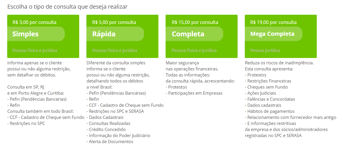 Consulta Pefin (Pendências Bancarias) e Refin nos Estados de SP e RJ e nas cidades de Porto Alegre e Curitiba, CCF, Restrições nas principais instituições de avaliação de crédito do mercado e Protestos, a nível Brasil. O resultado é apenas SIM ou NÃO, ou seja, se