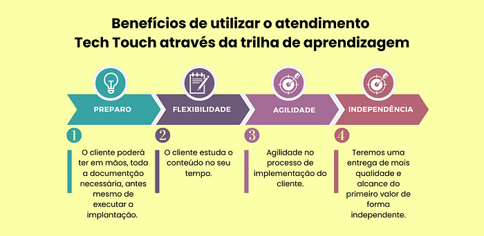 Ao estruturar uma trilha de implementação Tech Touch dessa maneira, é possível obter mais agilidade no processo de implementação e preparar o cliente de forma mais eficiente para as reuniões de consultoria, resultando em uma entrega de qualidade excelente e no alcance do primeiro valor de forma independente.
